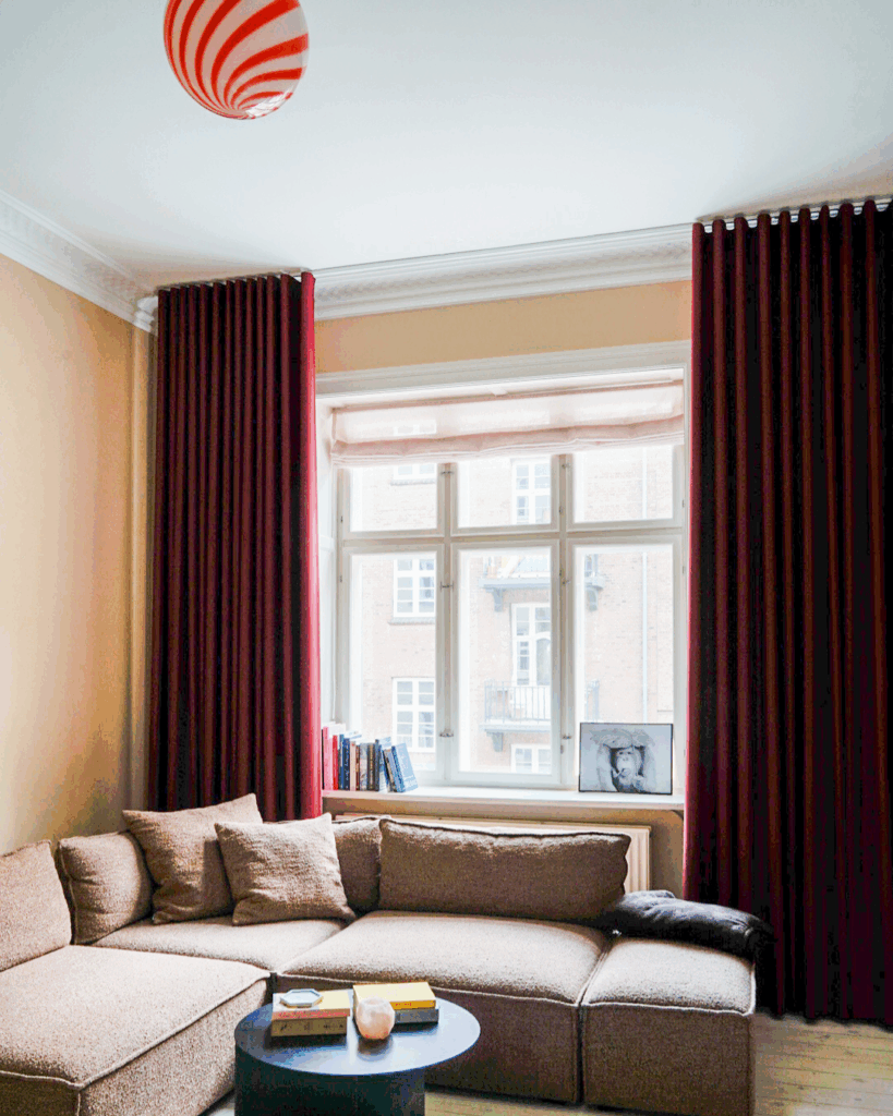 Hos Sarah Bro (@sarahwbro) har vi skabt en smuk, gennemtænkt væg-til-væg-løsning, der er opdelt i flere stykker. Det gør det muligt at trække gardinerne fra til både midten eller til siderne.