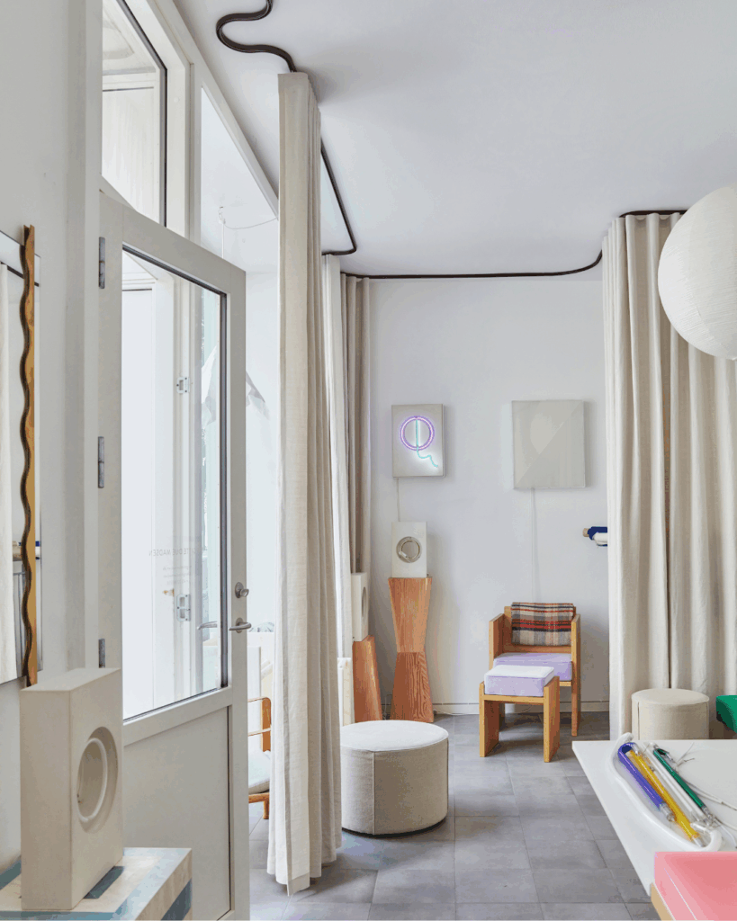 Med gardinernes svævende look, der lige netop rører gulvet, og det smukke farvevalg skaber det en løsning, der passer perfekt ind i den lyse og charmerende indretning.