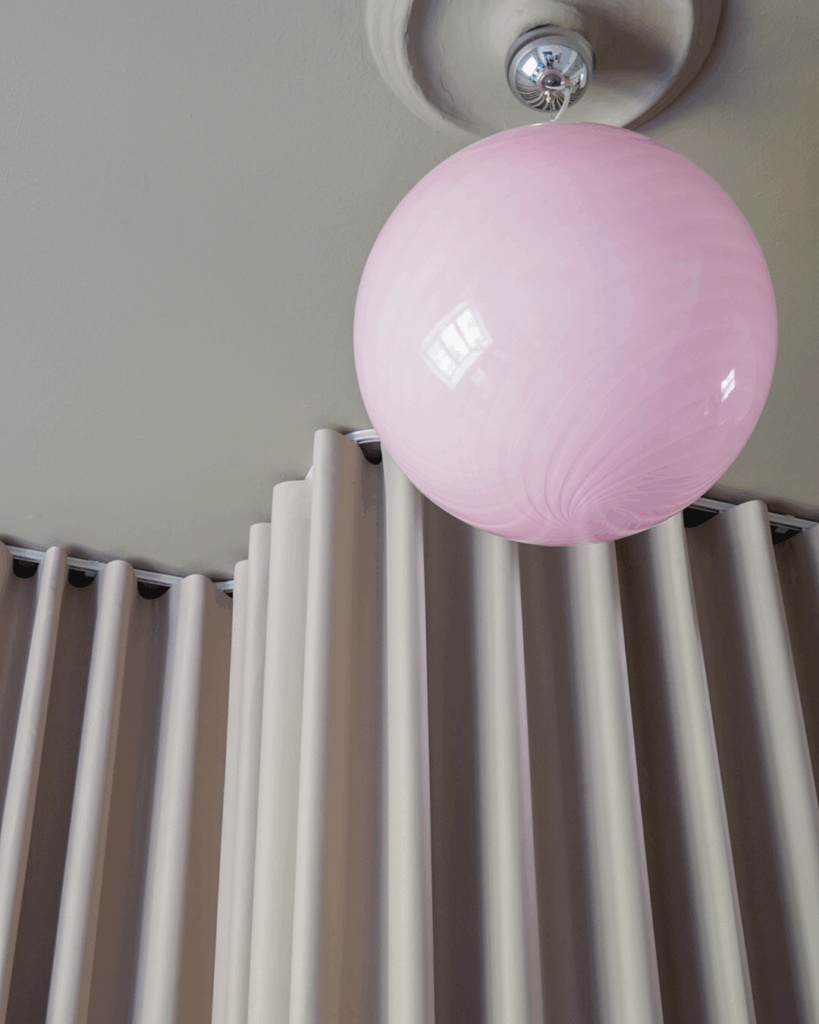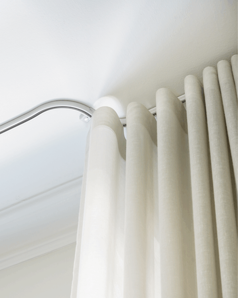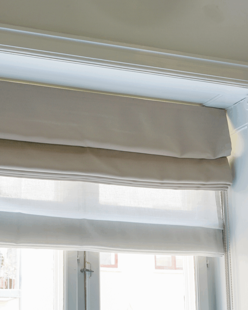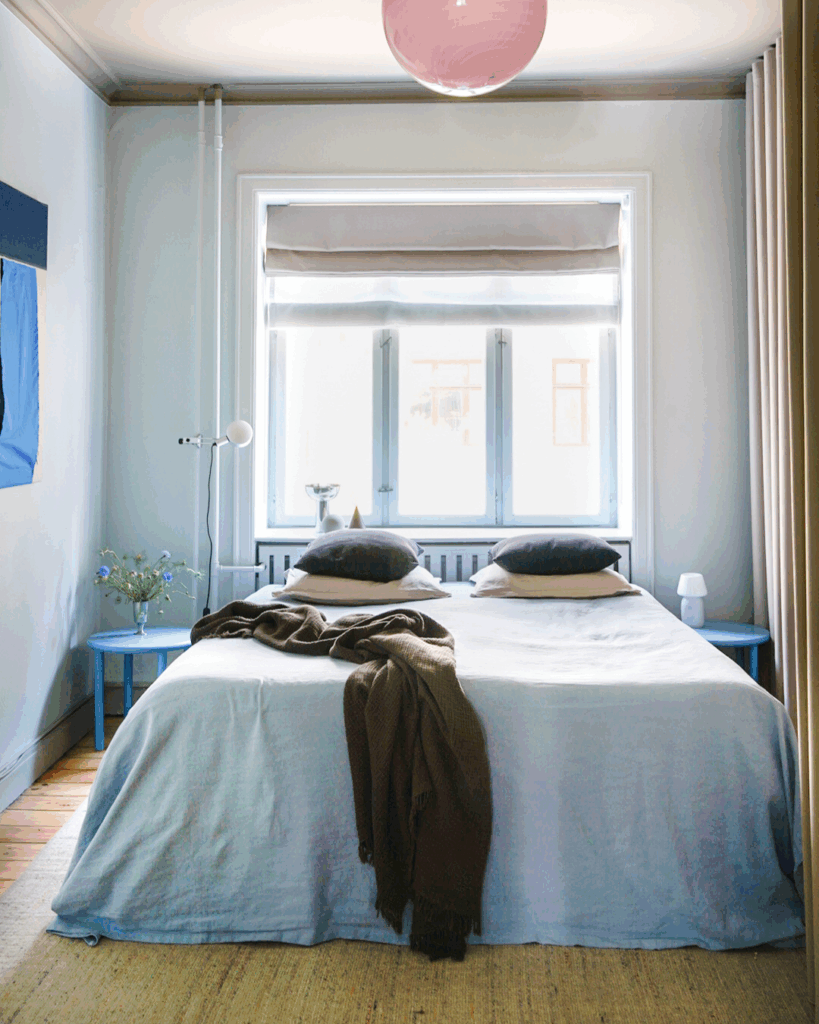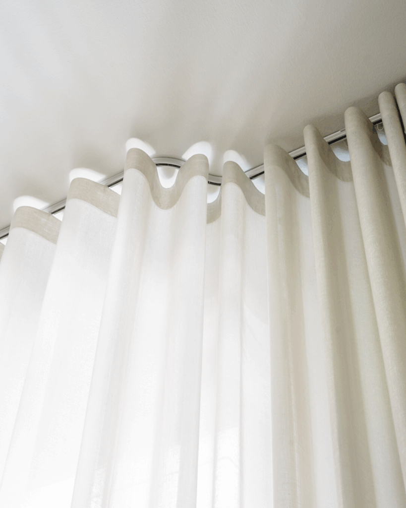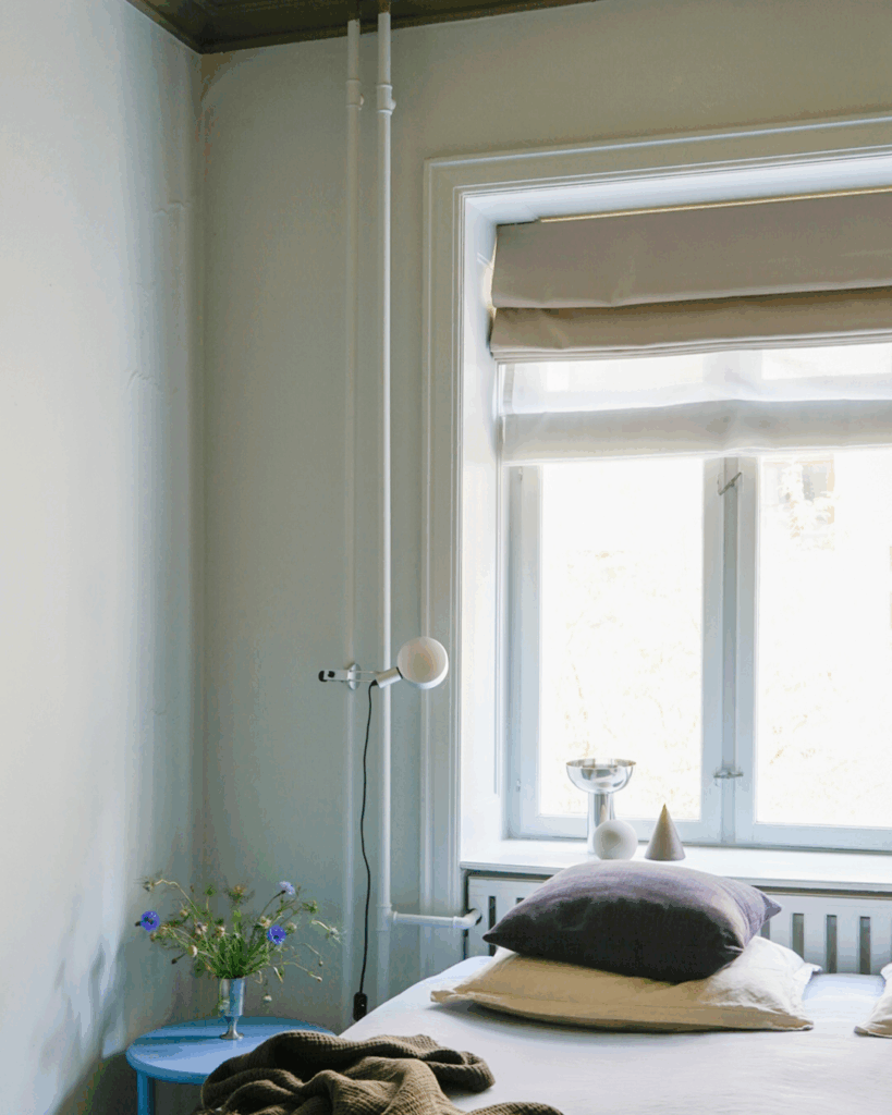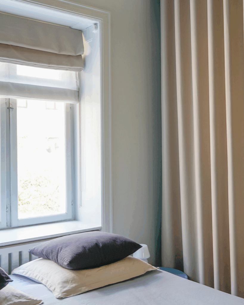 Garderoben i soveværelset er skjult bag en væg-til-væg gardinløsning i et mørklæggende stof. Skinnen følger garderoben med en let bue, så gardinet falder præcist og elegant. Ved vinduet har Nicolai valgt en kreativ, pladsbesparende løsning med to foldegardiner: et transparent til dagslys og et mørklæggende til nattetimerne.