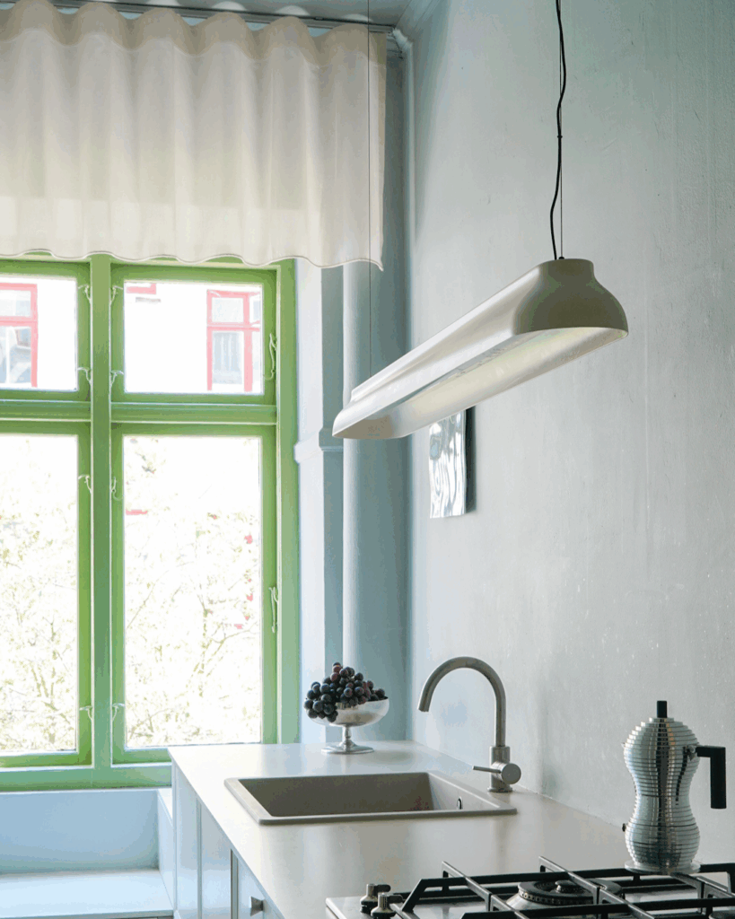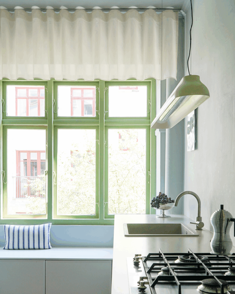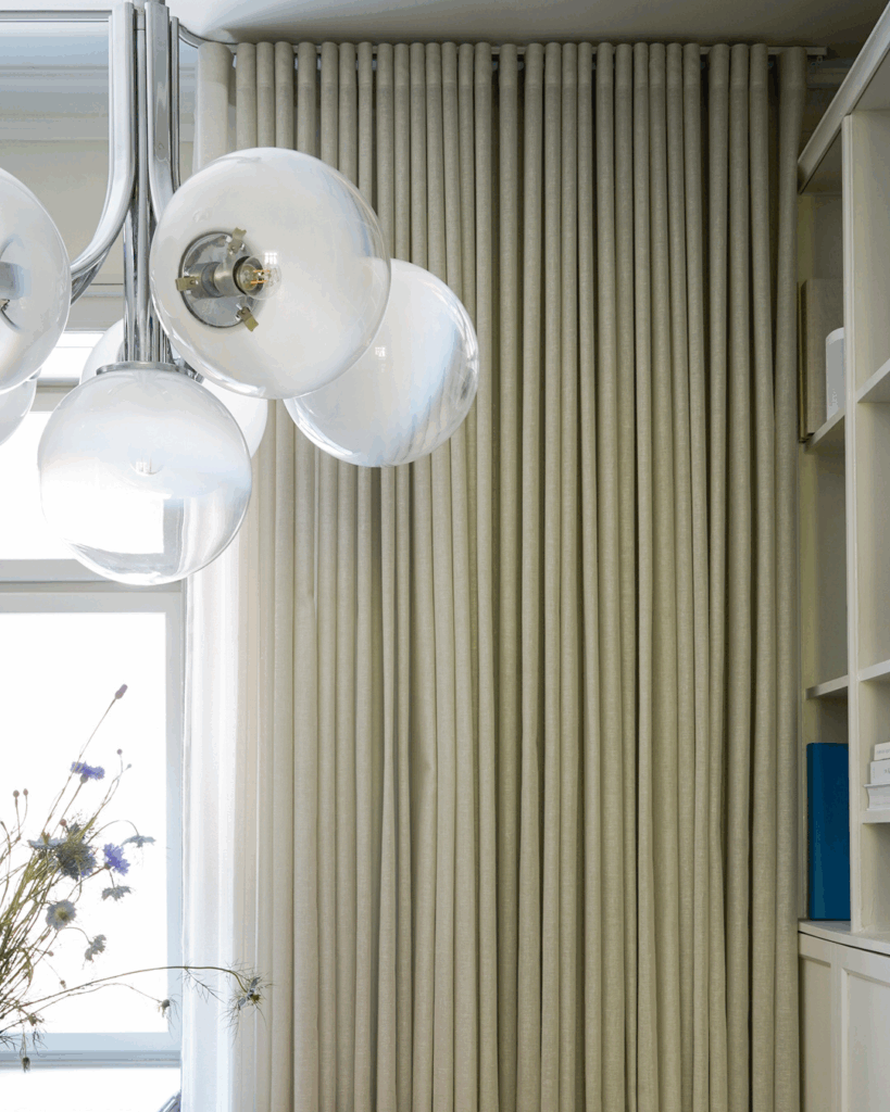 Til køkkenet har Nicolai valgt et dekorativt og kort, loftmonteret gardin i et transparent cremefarvet materiale, der giver rummet et varmt modspil til de hårde overflader og lige linjer. Den lille detalje giver karakter og tilfører et strejf af lethed og poesi til et ellers funktionelt rum.