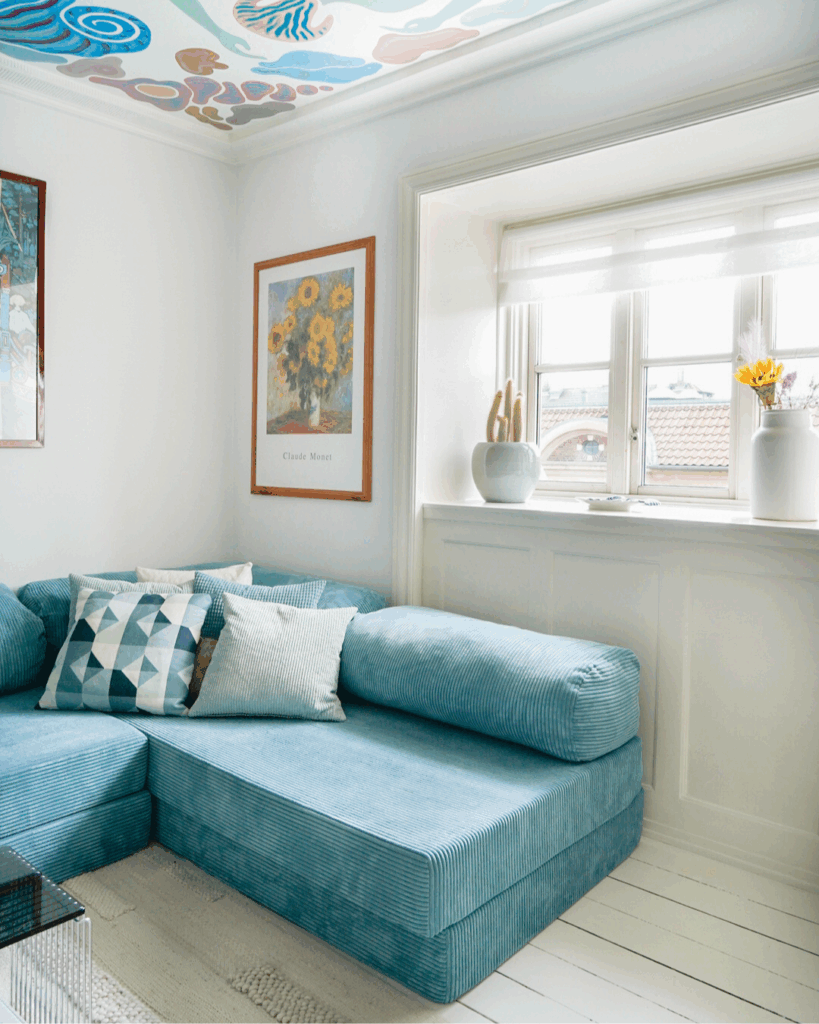 Loftet er dekoreret med et personligt og farverigt kunstværk, som man ikke forventer, når man træder ind i rummet. Den turkise sofa trækker blikket til sig med sin bløde overflade og friske farve, mens små farverige elementer rundt omkring skaber en legende stemning.
