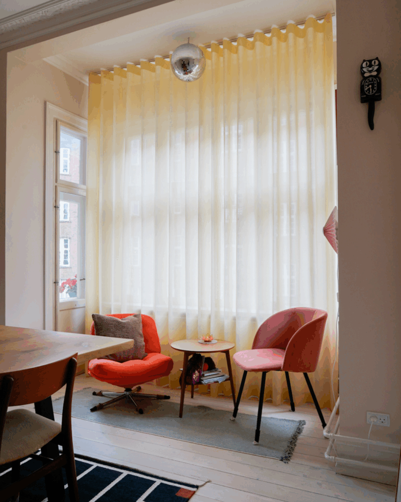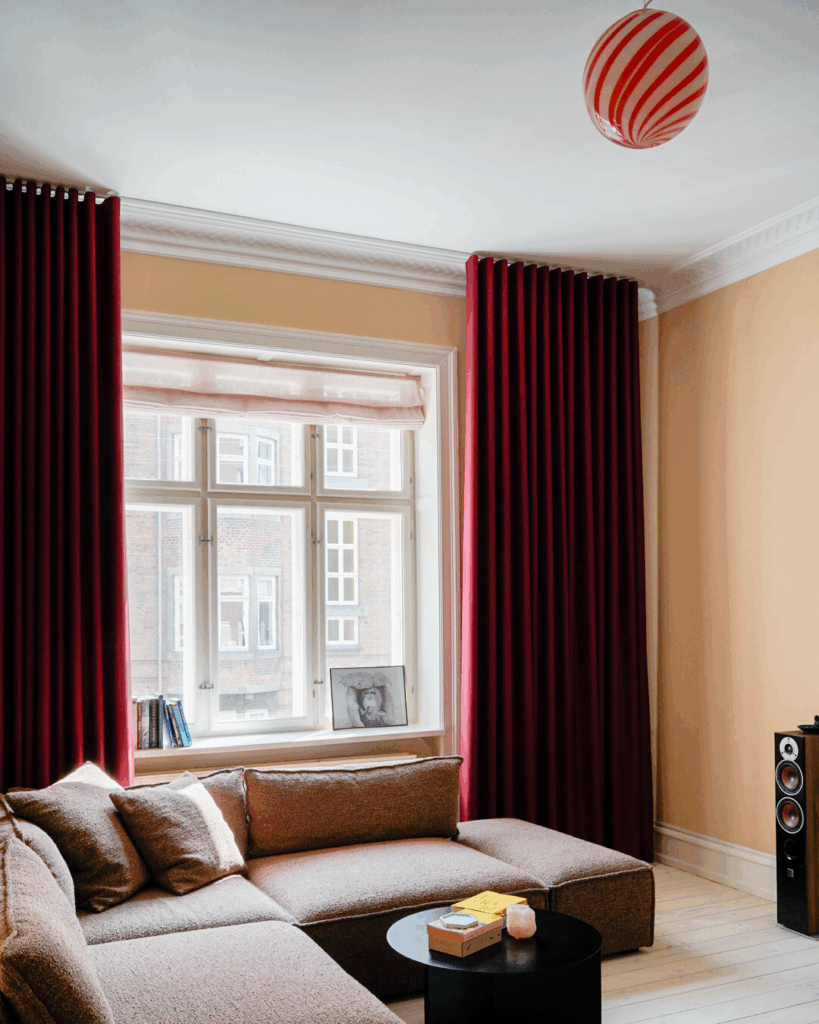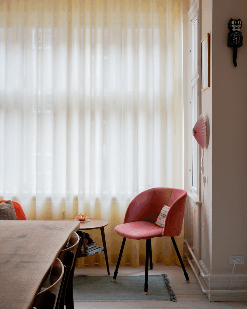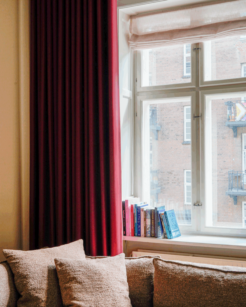 I dette legende og farverige hjem spiller gardinerne hovedrollen i en fortælling om lys, stemning og personlighed. I stuen falder blikket på de tunge, mørkerøde velourgardiner, der får rummet til at minde om en hjemmebiograf. I vinduet sidder et lyserødt, diskret foldegardin, der tilfører rummet lethed og balance.