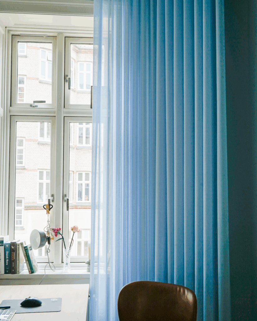 I kontoret sænker et roligt, blåt gardin tempoet. Farven bringer harmoni og koncentration, et perfekt modspil til hjemmets øvrige farvefest. Her er der plads til at forbyde sig.