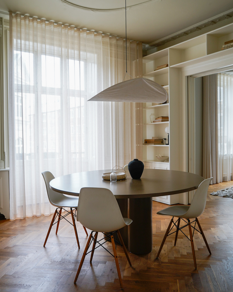Valget er faldet på lange, wavy stofgardiner fra vores Sivas kollektion i farven Cloud i både spisestuen og stuen, og de udgør således en klar rød tråd mellem de to rum.