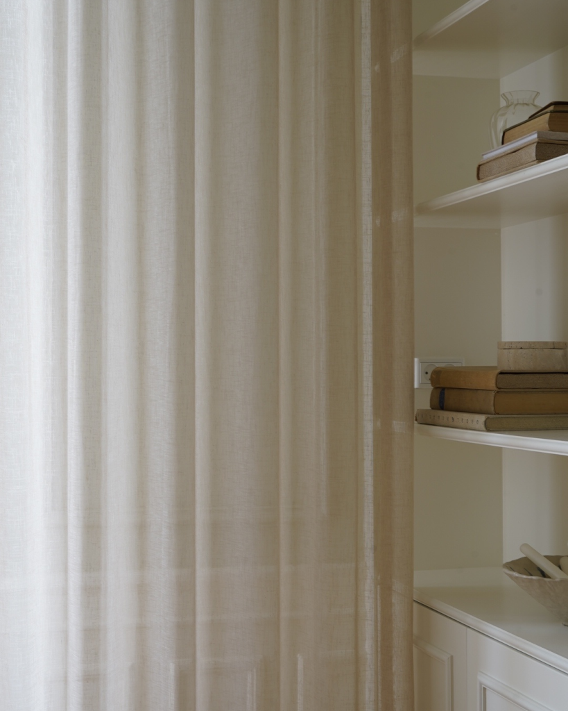 I Emmas hjem er det farverne lyse -og mørkegrå, beige, og forskellige varme, brune nuancer, der dominerer farvepaletten. De neutrale farver i vekslende nuancer slår tonen an og danner fundamentet for et smukt, gennemtænkt og minimalistisk hjem. Gardinerne spiller naturligt sammen med resten af hjemmet.