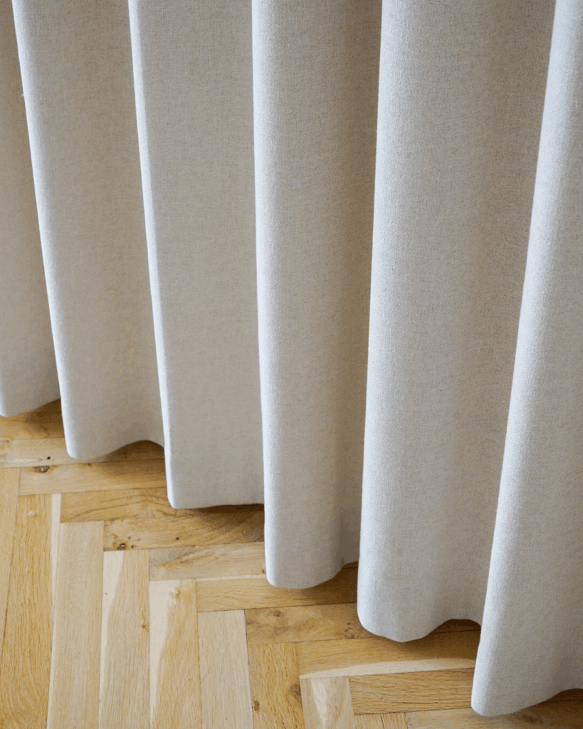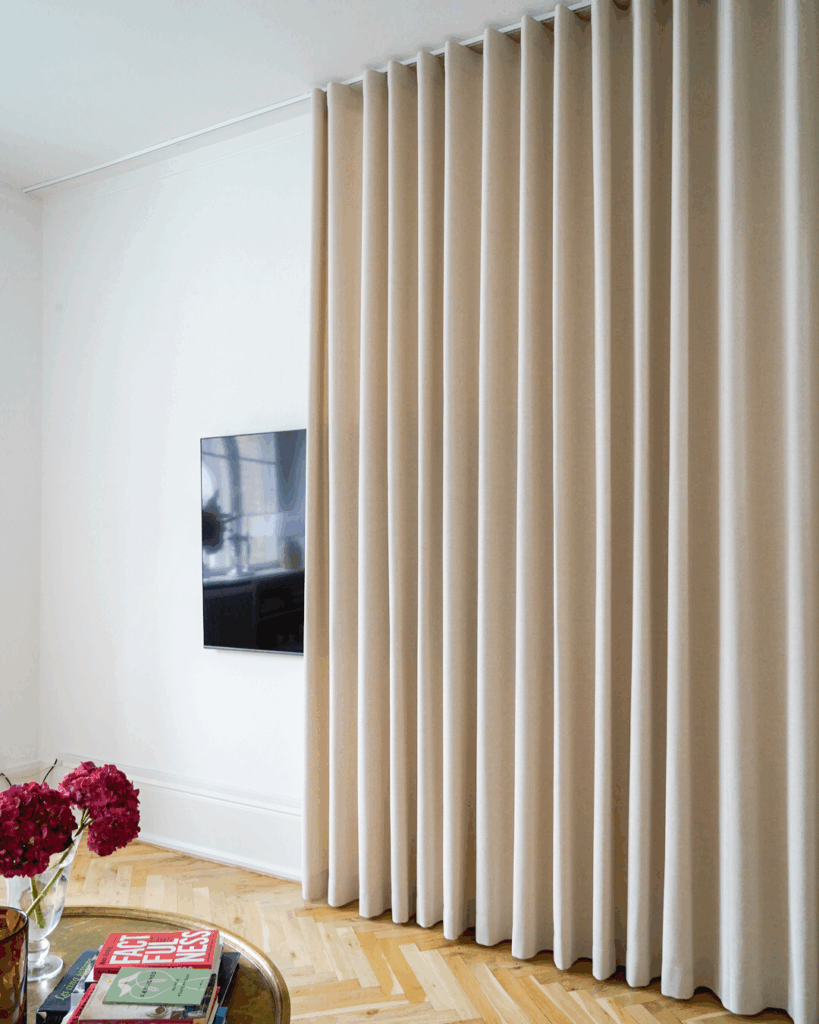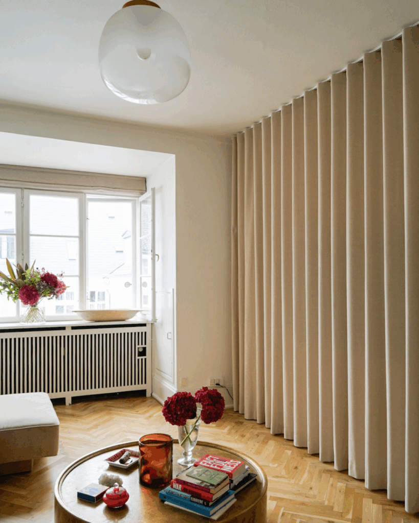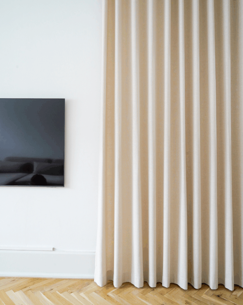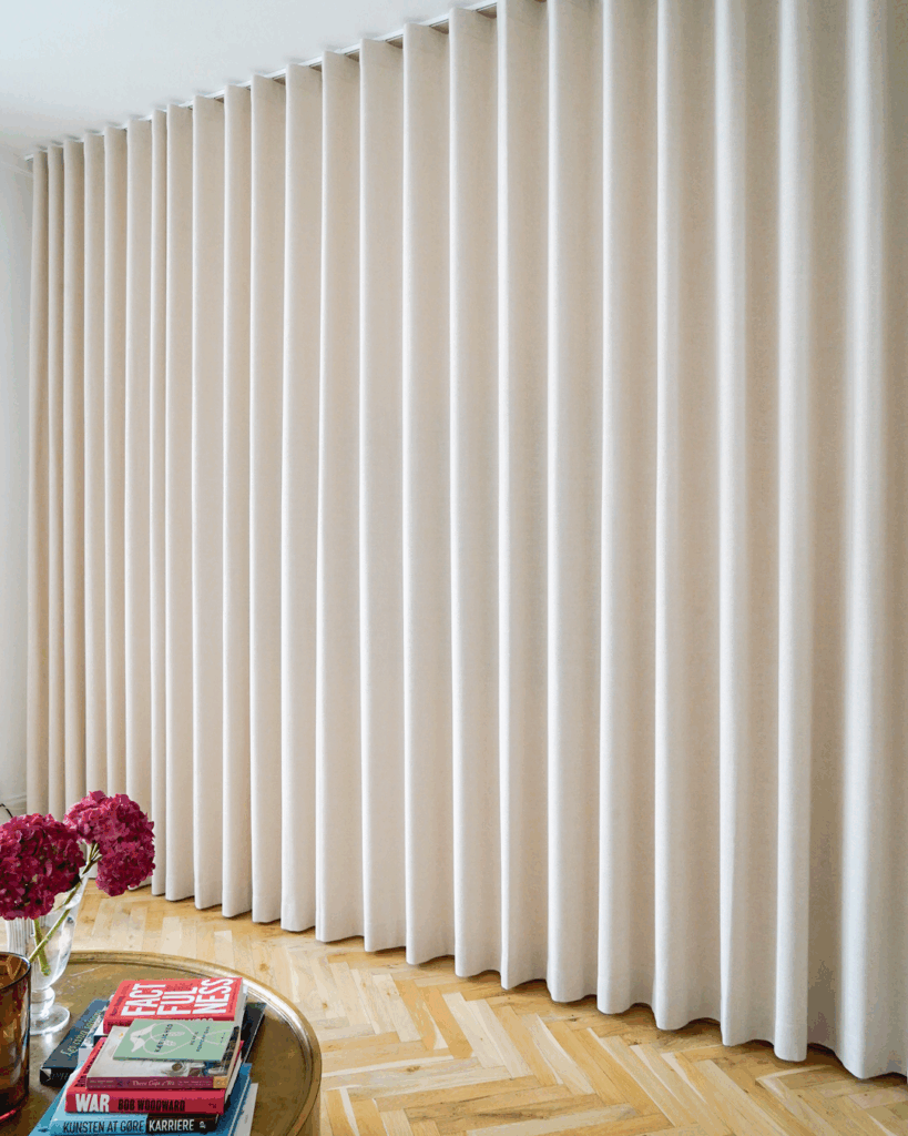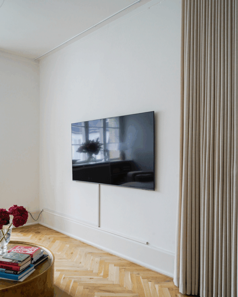 På væggen i stuen hænger der derimod lange, tunge gardiner i en kraftigere kvalitet. De går fra væg til væg og bidrager ikke kun positivt til rummets akustik, men fungerer også som en elegant løsning til at skjule fjernsynet. Når skærmen gemmes væk af de lange stofgardiner, skabes der ro og nærvær, idet fokus flyttes fra skærmen til samværet med familie og venner.