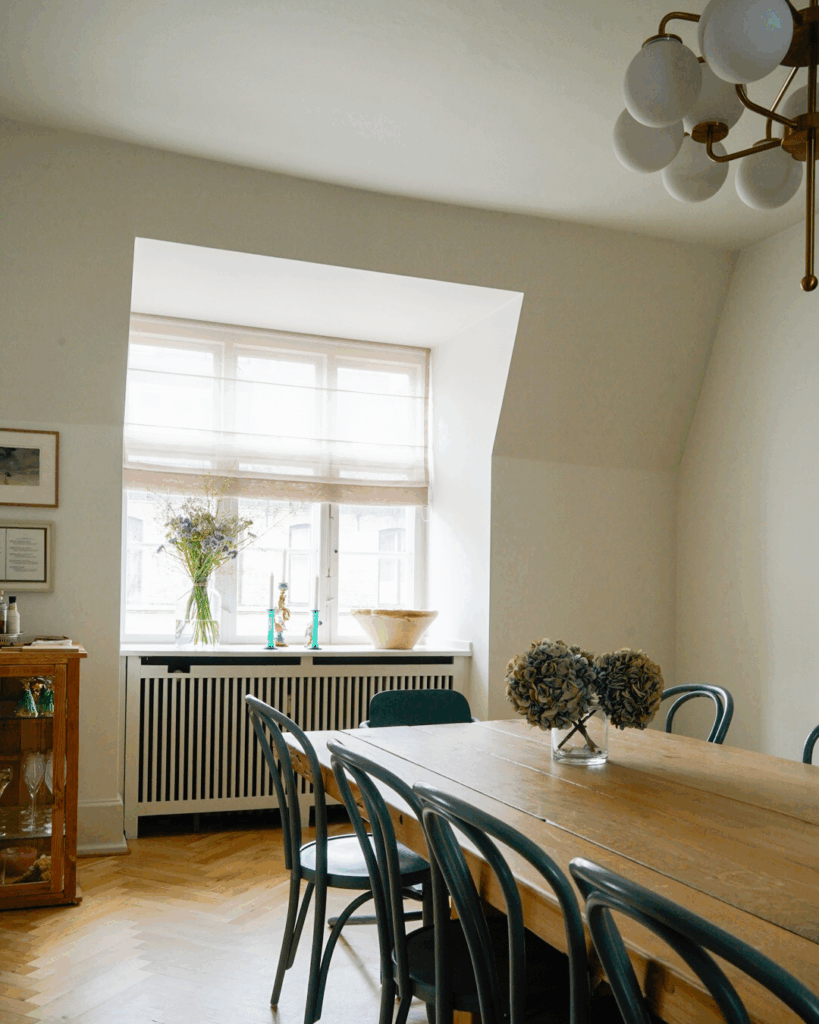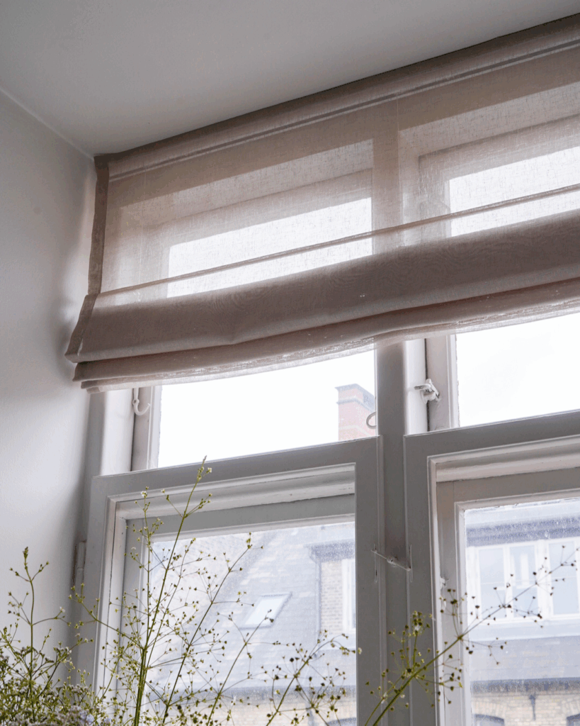 I stue og spisestue har Julie valgt foldegardiner i et let, transparent materiale. De er diskrete, nemme at betjene og giver mulighed for at regulere både sollys og privatliv.